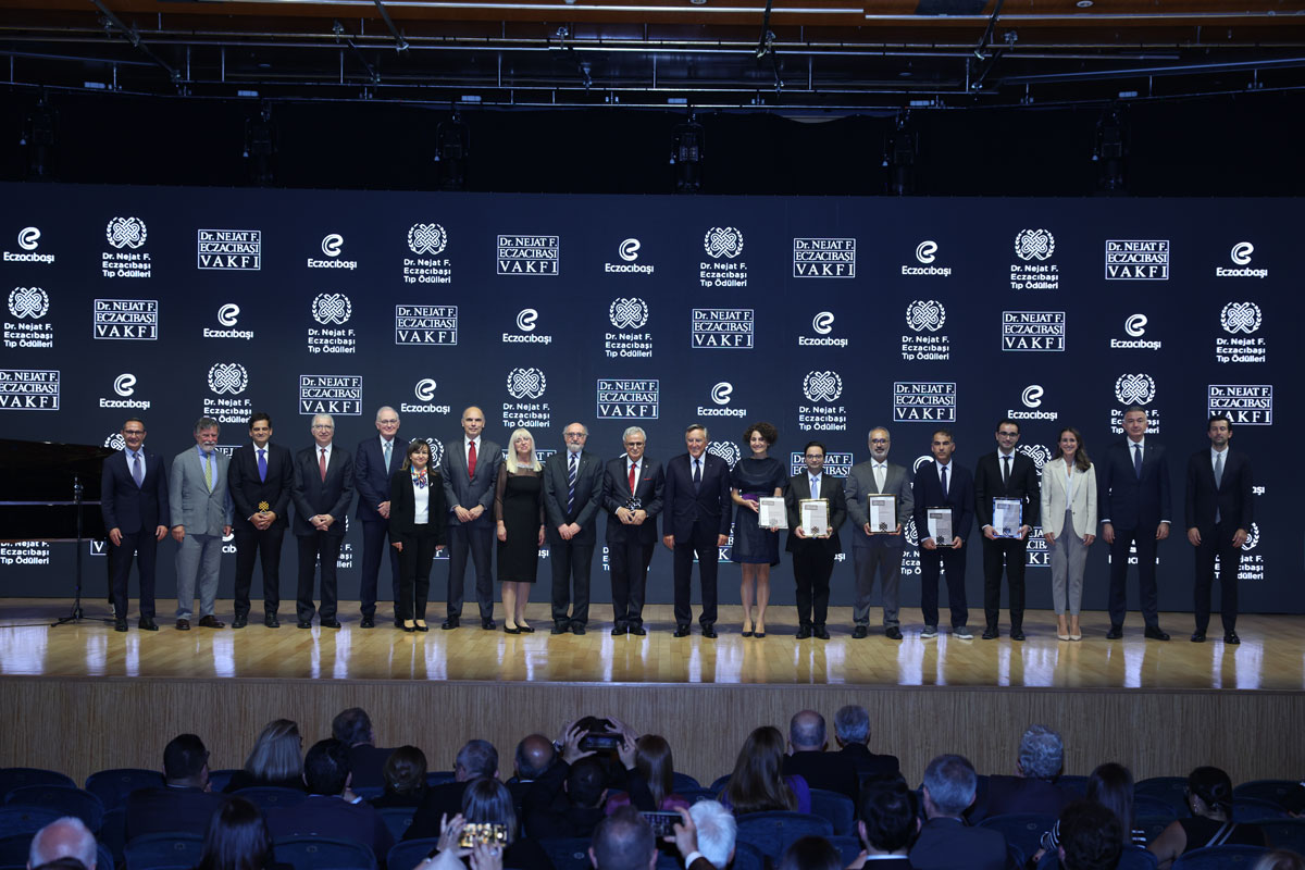 Soldan sağa: 2019 Dr. Nejat F. Eczacıbaşı Tıp Öğrencileri Proje Ödülü sahibi Sena Alptekin, 2019 Dr. Nejat F. Eczacıbaşı Tıp Bilim Ödülü sahibi Prof. Dr. Ahmet Höke, 2019 Dr. Nejat F. Eczacıbaşı Tıp Onur Ödülü sahibi Prof. Dr. Marsel Mesulam, 2019 Dr. Nejat F. Eczacıbaşı Bilimsel Araştırma Destek Ödülü sahibi Doç. Dr. Ceyda Açılan Ayhan, 2019 Dr. Nejat F. Eczacıbaşı Tıp Teşvik Ödülü sahibi Doç. Dr. Uğur Canpolat