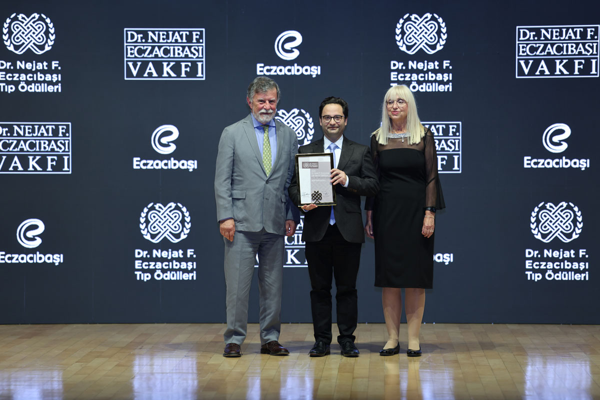 Soldan sağa: Dr. Nejat F. Eczacıbaşı Tıp Ödülleri Bilimsel Değerlendirme Kurulu Başkanı Prof. Dr. Turgay Dalkara, 2019 Dr. Nejat F. Eczacıbaşı Bilimsel Araştırma Destek Ödülü sahibi Doç. Dr. Ceyda Açılan Ayhan, Eczacıbaşı Holding İnovasyon ve Girişimcilik Koordinatörü Emre Eczacıbaşı